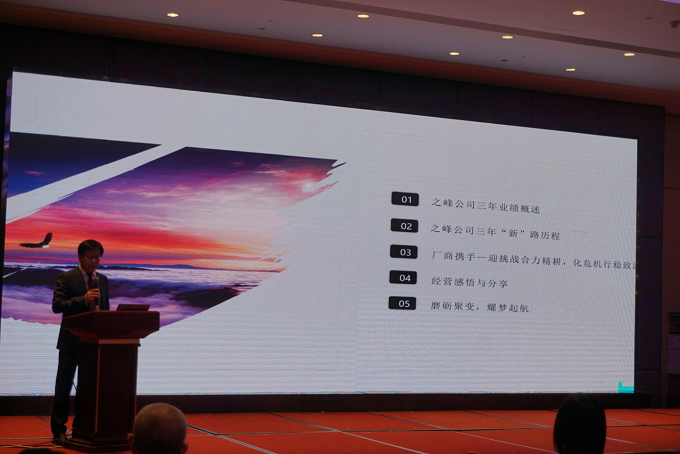 9点钟大会正式开始,马海龙总裁发表“合力谋发展,共赢创未来”的主题演讲,讲述着时代之峰公司不畏艰辛,勇登新高峰的篇章;介绍着三年的“新”路历程,坚定不移的走不断创新之路;坚持厂商携手——迎挑战合力勤耕,化危机行稳致远的故事;述说着经营感悟与分享,与经销商朋友分析经营的感悟与经验;展望着磨砺聚焦,筑梦起航五个篇章。演讲过程中大家纷纷额首,掌声不断。