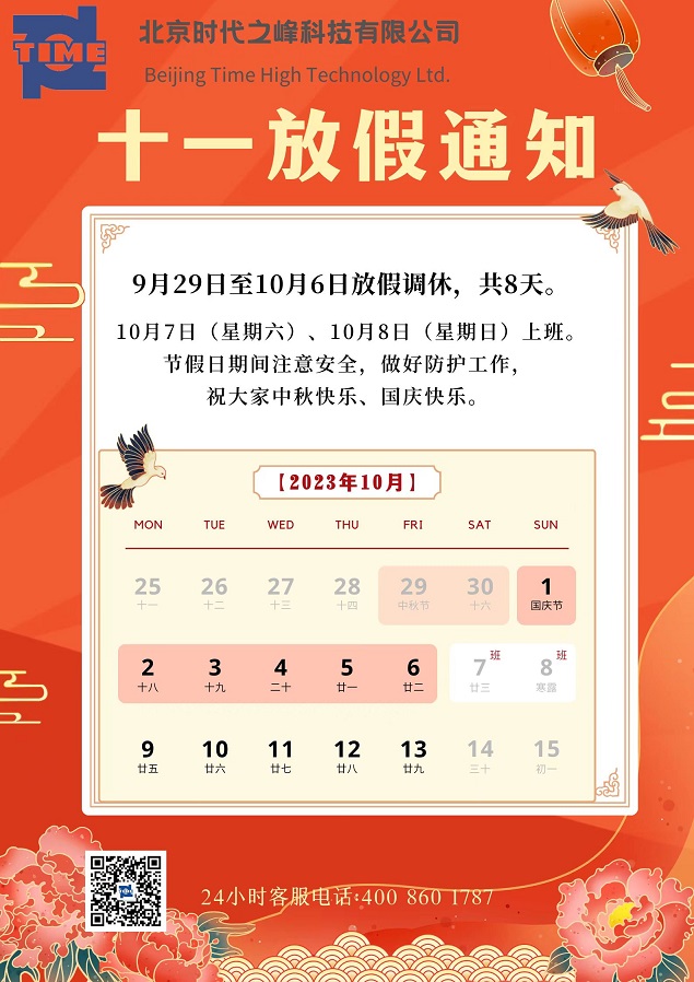您好! 时代之峰2023年中秋及国庆放假安排通知如下: 9 月29日 —10月6日 放假,共8天,10月7日(星期六)正常工作。