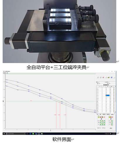 {C}11. {C}本机特别适合端淬试验,可完全按照《钢淬透性的末端淬火试验方法 GB/T225-2006 》的要求,设置硬度测试的路径后一键完成测试工作,配备三工位夹持台,可实现三个端淬试样的连续测定(夹持台可增配至六工位) ;